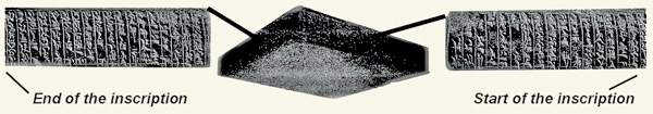 This inscription was written in vertical columns that are read from left to right and top to bottom on two sides of the brick (which was presumably used at a corner, so that the two inscribed faces were visible). Most of the rest of the text is known from other examples, but the last two lines are not found elsewhere:  Lambert translated them (at p. 66) as follows: