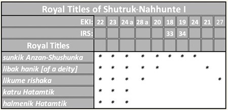 The table above compared the royal titles that Shilhak-Inshushinak used on his many other surviving royal inscriptions.   Two of them (EKI 56 and 45) use the five titles used by  Shutruk Nahhunte in EKI 22-24a (above)