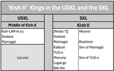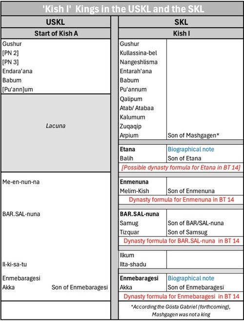 As we have seen, the USKL text begins with about 30 kings of Kish, which Gösta Gabriel (referenced below, 2023 at p. 244) dubbed the ‘Kish A’ list. He argued that it must have been largely compiled from the Kishites’ own historiographical tradition, in which case: