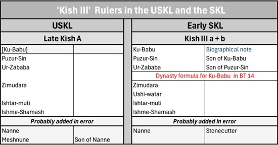 Table 6 shows how the early part of this list was used as a basis for the SKL record of the rulers of the Kish I dynasty. As Piotr Steinkeller (referenced below, 2003, at p. 274) observed: