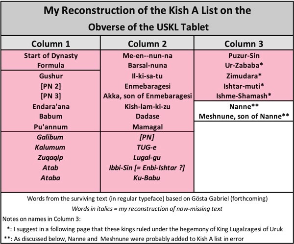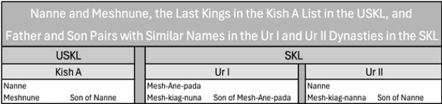 “Is it possible that [the USKL kings] Nanne and Meshnune are in fact Mesanepada and Meskiagnuna of Ur, whom the USKL classified as Kishite rulers because Mesanepada held the title of [king of Kish]? If so, [their reclassification in the SKL as Ur I kings] would be fully justified.”