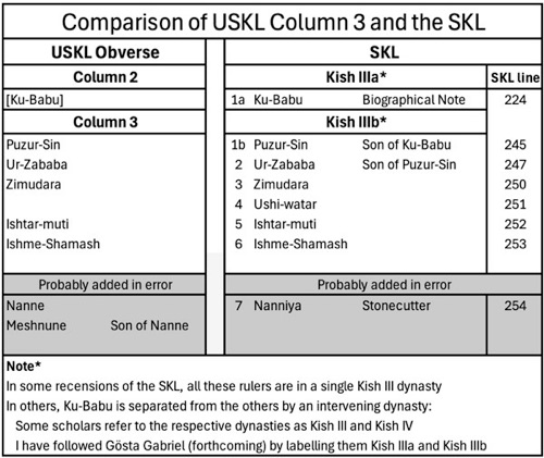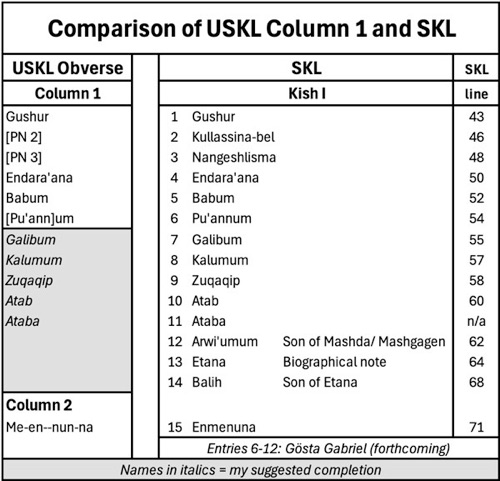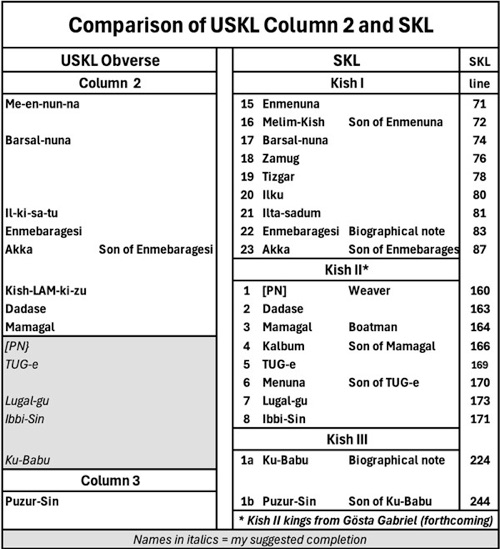 ✴the five kings named after Gushur in obverse column 1 of the surviving part of the USKL tablet correspond to the 2nd-6th ‘Kish I’ kings in the SKL; and