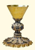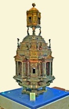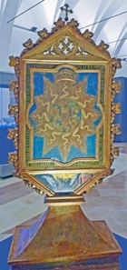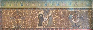•the gilt frieze above contains embroidered images of Franciscan saints; and