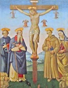 •the altar frontal below, which was originally in three pieces, contains a central field in which Sixtus IV kneels at the centre before St Francis. The saint displays the stigmata on his right hand and holds a cross in his left hand.