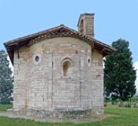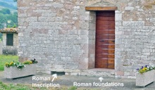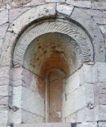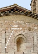 The circular windows in the apse were re-opened during the recent restoration of the church. The central window has an interesting sculpted frieze above it. A Roman inscription incorporated into the pilaster to the left of this window commemorates the baby Faustus, brother of Lucius Turpilius Salvius.