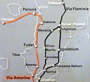 Vettona later benefited from the extension of Via Amerina from Ameria (Amelia) to Perusia (Perugia). Simone Sisani (referenced below, 2007, at p. 121) pointed out that the extension of this road must have pre-dated the early 3rd century BC, when Porta Marzia was built at Perusia to monumentalise its entrance into that city. He suggested that its extension might well have been associated with the conquest of the ager Gallicus by Manius Curius Dentatus in 283 BC: a branch from Perusia to Iguvium would have constituted the most convenient way of reaching the Adriatic from Rome before the construction of Via Flaminia in 220 BC.