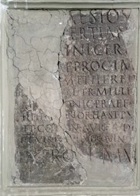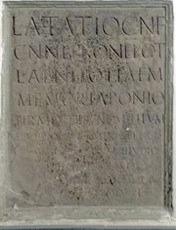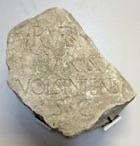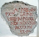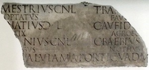 This fragmentary inscription (CIL XI 5040) relates to another paving project that had been financed by the magistri/ novemviri Valetudinis. According to Giuseppina Prosperi Valenti (referenced below, 2005, entry 3), they were found in ca. 1876 behind the church of San Silvestro (see Walk I). The surviving fragments records the names of six freedmen in two columns: it seems likely that there were originally three columns and a total of nine names. The surviving names are: