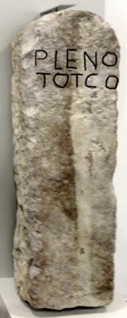This limestone sundial =in the Sala dei Br0nzi was ploughed up in 1969 near the tabernacle of the Madonna del Core, outside Porta Cannara. The Umbrian inscription on the sundial, which uses an Etruscan alphabet, can be transcribed as: