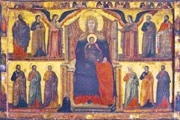 ✴The central panel (illustrated here, courtesy of the Comunità Missionaria di Villaregia) contains a representation of the Assumption of the Virgin in which Christ embraces His mother as they ascend to Heaven in a mandorla carried by angels. This iconography is similar to that in the fresco by Cimabue on the altar wall of the upper church of San Francesco, Assisi, in which Christ and the Virgin sit side by side in an intimate pose as angels bear them to Heaven. For more information on this interesting iconography, see this website by Andrea Lonardo.