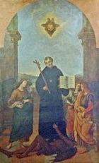 ✴St Nicholas of Tolentino stood on a prostrate figure of Satan in the centre of the lower part of the composition;