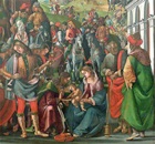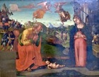 The Vitelli family probably influenced the choice of subject of the altarpiece: like the Medici and the Baglioni families, they probably identified the theme with princely patronage. The figure in a red hat and on horseback at the top right has been variously identified as Camillo, Paolo or Vitellozo Vitelli.