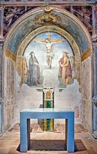 This fragment of a fresco of the Madonna and Child enthroned with angels is in the “Voltone” of Palazzo Ducale. A degree of over-painting was removed in a recent restoration, and it is now attributed to Orlando Merlini.