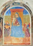 Francesco Melanzio worked almost exclusively in his native Montefalco. The house in which he lived (illustrated above) survives outside Porta Camiano (see the Walk). His early work suggests that he had been a student of Fiorenzo di Lorenzo. He became the master of his nephew, Febo Melanzio.