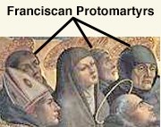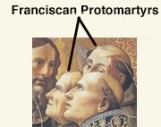 The figure behind St Bonaventure, who wears a black hood and has a head wound, is almost certainly St Berardo (the name saint of Cardinal Eroli, also illustrated above), one of the five Franciscan protomartyrs, who had been canonised in 1481. The other four protomartyrs, who also sport head wounds, are included in the composition (two on the extreme right and two to the left of St Berardo).