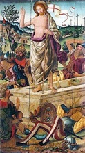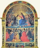 In the upper register of the main panel, Christ crowns the Virgin, surrounded by angels, many of whom play musical instruments, together with patriarchs and prophets. 22 saints in the lower register meditate on the scene The saints include: