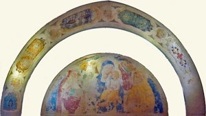 This damaged fresco, which came from the lunette of a portal of the church, is exhibited in together with the decorative frescoed cornice of the composition. The main scene, which depicts the Madonna and Child with SS Francis and Jerome, is attributed to Pierantonio Mezzastris. Cardinal Berardo Eroli, who financed the restoration of San Girolamo in 1465-71, probably commissioned these frescoes, at the same time that he commissioned those in what is now the Eroli Chapel, San Francesco.