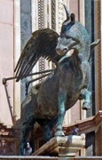 This marble figure was commissioned from Raffaello da Montelupo to stand above the right entrance, “facing to the church of San Giacomo". It must have been completed by 1561, when copper for its wings and gold leaf were purchased. It was restored in 1816. It was moved to the Museo dell’ Opera del Duomo in 1964 and replaced by a copy.