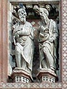 These figures of the theologians who (among other things) defined Marian doctrine surround the rose window. Pietro di Puccio was recorded as working on the originals in 1388. These were detached and replaced by copies in the 19th century. Fragments depicting SS Jerome and Ambrose survive in the Museo dell' Opera del Duomo (see below).