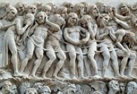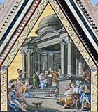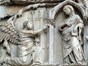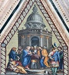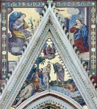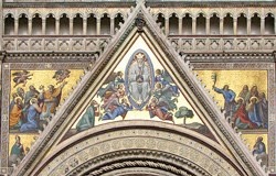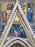 These heavily restored scenes above the central door still bore the signature of Giovanni di Buccio di Leonardello and the date 1366 in the 19th century. Angels transport the Virgin in a mandorla while the Apostles to the sides witness the scene. This was originally above a sculptural group of the Madonna and Child with angels in the lunette above the central door that is now in the the Museo dell' Opera del Duomo (see below).