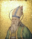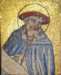 These documented mosaics belong to a set of the four Doctors of the Church that Pietro di Puccio executed to surround the rose window on the facade of the Duomo. They were detached and replaced by copies in the 19th century. Fragments depicting SS Jerome and Ambrose survive in Room IV of the Museo dell' Opera del Duomo.