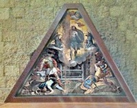 However, the tympanum itself was not built until 1532. By 1584, when the Opera del Duomo turned its attention to its mosaic, the plan had changed, and the mosaic commissioned from Cesare Nebbia actually depicted the Resurrection of Christ. This was probably intended to complete the series of scenes from the Passion depicted by the altarpieces in the right aisle (see the page on the 16th century remodelling). Work on the mosaic extended over the period 1584-7. Nebbia was still complaining in 1591 that neither he nor his collaborators had been paid for their work, because of doubts about the stability of the mosaic. A preparatory cartoon for this mosaic has recently been rediscovered and restored and is now in the Museo del Opera del Duomo (see below).