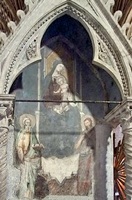 This damaged fresco in second bay of the left transept is attributed to Pietro di Puccio. It depicts Madonna and Child with SS Antony Abbot and Mark and a donor.