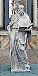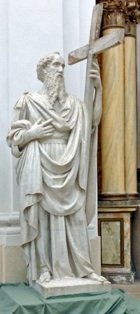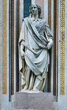 A team under Raffaello da Montelupo began work on the figures of Apostles for the niches above the rose window in the facade of the Duomo in 1560. The middle four figure (two of which are illustrated here) are attributed to him. Work continued until 1570, by which time Raffaello da Montelupo was dead. The four to the right, which presumably belong to the later phase of the project, are attributed to Fabiano Toti.