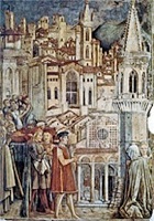 This scene is set in a cityscape that gives a valuable picture of Colle Landone before the building of the Rocca Paolina (1540). Thus we see the ruins of the Roman amphitheatre, Porta Marzia before its relocation, the towers of the Baglioni palaces and the church of Sant' Ercolano before the demolition of its upper storey.