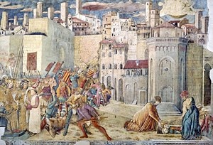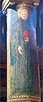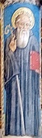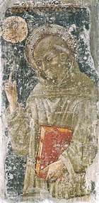 The fresco depicts the saint shortly before his death. He points to a disc in the top lefthand corner that probably originally contained the letters “IHS”, the holy name of Christ.
