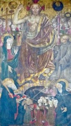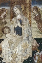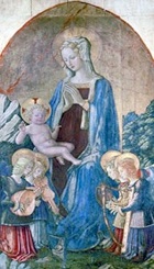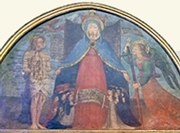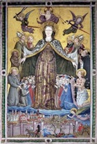 The fresco depicts the Virgin shielding the people of Perugia under her cloak, with St Sebastian on the left and an angel holding the sword of faith on the right, [while God the Father fulminates above]. Inscriptions in poetic Italian document an exchange between the Virgin and St Sebastian.