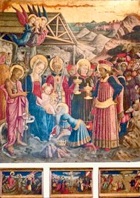 In the main panel, the three kings present their gifts to the baby Jesus, who is on the lap of the Madonna and flanked (as in a conventional sacre conversazione) by SS John the Baptist and Nicholas of Bari (the name saint of the presumed donor). The figures are placed in front of the crumbling stable, which is set in a rocky landscape outside the walled city of Bethlehem.