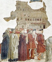 The citizens are assembled in the Piazza di San Francesco, presumably at the end of the annual procession. Behind them is the facade of the Oratorio di San Bernardino, which had been completed only four years earlier. The image of San Francesco al Prato to the right provided important evidence for the original appearance of its facade that facilitated its restoration in 1926.
