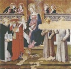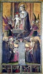 The panel depicts the Madonna and Child enthroned with SS Thomas Aquinas, Jerome (with his lion), Francis and Bernardino in front of a low parapet, behind which stand four praying angels. It is odd that the most prominent of these saints is the Dominican, St Thomas, to whom the baby Jesus passes a bright object that is an allegory of his teaching. Each of the saints holds a book, but that of St Thomas is open, revealing the words that Christ spoke to him as he prayed before a Crucifix: “Bene scriptisi de me Thoma ...” (You have written well of me Thomas ...).