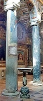 ✴The fresco of St Peter Abbot is on the 2nd column of the left, which is known as the column of the miracle. This refers to an accident that happened in ca. 966 during construction, when the column fell and nearly killed a workman. However, St Peter was able to stop it in mid air by making the sign of the Cross. The column remains asymmetrically mounted on its base: the fresco and the cross is carved on the capital above also record the miracle.