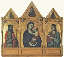This triptych, which is attributed to Meo di Guido, survives in its original frame. It was probably commissioned for San Domenico Vecchio. It is now in the Museo Capitolare (Room 15).