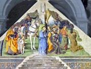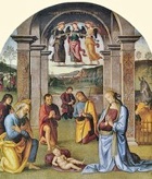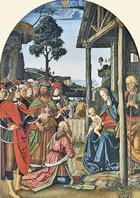 ✴The work commissioned by Cardinal Domenico della Rovere for his chapel in Santa Maria del Popolo, which is generally attributed to Pintoricchio, seems to have been executed at some time between 1478 and 1482. It includes an altarpiece of the Adoration of the Magi that is closely related to the altarpiece (ca. 1470) from Santa Maria dei Servi,Perugia, which is attributed to Perugino (see below).