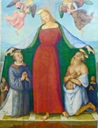 This fresco is on a wall in what is now the Cappella della Consolazione of the nunnery of Sant’ Agnese. The nuns have always venerated it because they believe that it protects their community. It is in the form of a frescoed triptych, with the orant Virgin with two kneeling nuns in a landscape, flanked by SS Antony Abbot and Antony of Padua. Its recent restoration has confirmed its attribution to the aged Perugino.