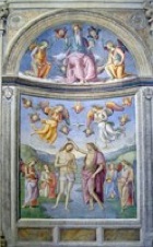 The main scene of the baptism of Christ is set in a landscape and witnessed by angels. God the Father looks down on the scene from the lunette above.