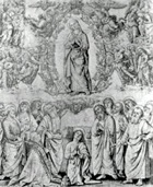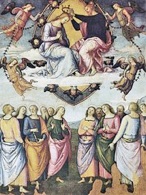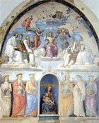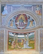 ✴On the side facing the congregation, the Apostles witness the Coronation of the Virgin, which takes place in a mandorla supported by angels. (The friars specified the enthroned Christ and the Virgin with four saints below: the final composition reflected that of the Coronation of the Virgin (1486) that Domenico Ghirlandaio had painted for the high altar of the church of another Observant Franciscan convent, San Girolamo, Narni.