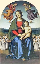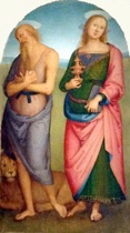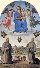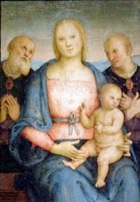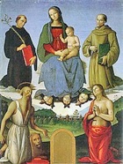✴The composition, and in particular the figures of SS Francis and Jerome seem to derive from the Madonna di Loreto (1507), which Perugino painted for Santa Maria dei Servi and which is now in the National Gallery, London (see below).