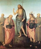 The panel depicts St John the Baptist standing in a landscape, flanked by SS Francis, Jerome, Sebastian and Antony of Padua. The figure of St Sebastian is curiously dressed and has been adapted, somewhat opportunistically, from a cartoon used in Perugino's frescoes (ca. 1500) in the Collegio di Cambio. Two other stylistic considerations provide circumstantial evidence for the dating to ca. 1510:
