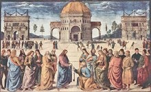 Perugino seems to have based this composition on that of his fresco (ca. 1480) of Christ giving the keys of Heaven to St Peter in the Sistine Chapel, Rome (see below). The marriage takes place in front of the Temple. St Joseph holds the rod that flowered in order to identify him as the bridegroom selected by God: the other suitors stand behind him, and one of them breaks his own rod because it failed to flower.