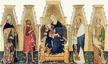 The altarpiece, which depicts the Madonna and Child enthroned with SS Peter, Catherine of Alexandria, Agatha and Paul and two praying angels above, is now in the Galleria Nazionale.