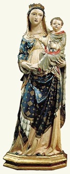 The Madonna is modelled as a full-length figure in regal costume, wearing a crown and carrying the baby Jesus on her hip. He is also regally dressed, and holds a bird in His right hand (probably a finch, which is a symbol of the Passion). Recent restoration has revealed the original polychrome decoration, which is in a good state of preservation that is unusual in a work of this age. The work is sometimes attributed to Ambrogio Maitani.