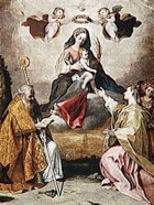 The altarpiece depicts the Madonna and Child enthroned with SS Antony Abbot and Lucy. The baby Jesus offers a palm of martyrdom to St Lucy while two flying angels hold a crown above the head of the Virgin.