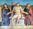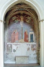 This fresco is in a niche in the Cappella del Crocifisso, on the transept side of the wall that separates the transept from the nave. It depicts the dead Christ being lowered on a sheet into a marble sarcophagus. The Virgin stoops to kiss Him, St Mary Magdalene holds His hand, and St John the Evangelist looks away in anguish. The figure of Joseph of Arimathea, who holds the sheet at the feet of Christ, is particularly fine.