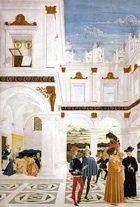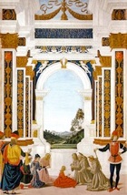 These panels are among the earliest surviving works in Perugia that fully reflect the aesthetic of Renaissance Florence and of the courts at Urbino and Rimini, and it is surprising that they went unrecorded for so long. They were almost certainly commissioned in response to the translation of the relics of St Bernardino to the new church of the Observant Franciscans in Aquila in 1472. The scenes depicted were derived from the “Lo Specchio de l’ Ordine Minore” (otherwise known as “La Franceschina”), which was published by the Observant Franciscan Giacomo Oddi of Perugia in ca. 1474.