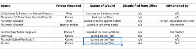 The important point for the discussion in hand is that neither Dionysius not Plutarch recorded that Cocles had lost his eye in the engagement at the pons Sublicius. However, the so-called Pseudo-Plutarch drew a direct comparison between the wounding of king Philip II on the river Sandanus and that of of Cocles on the Tiber, when each was wounded in the eye: