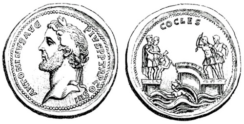 “Horatius Cocles ... [happened] to be on guard at the pons Sublicius when Porsenna captured the Janiculum, [the hill just beyond the bridge], by a sudden assault. [Cocles] ... commanded [his terrified colleagues] to break down the bridge ... and promised that he would [single-handedly] hold the enemy [while they did so] ... He held his ground ... [until the enemy advance was checked by] the crash of the falling bridge”, (‘History of Rome’, 2: 10: 2-10) .