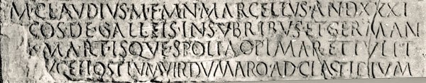 “M. Claudius Marcellus, proconsul [in the year that we call 222 BC], triumphed over the Insubrian Gauls and the Germans on 1st March: he brought back the spolia opima after killing the enemy leader, Virdumarus, at Clastidium”.